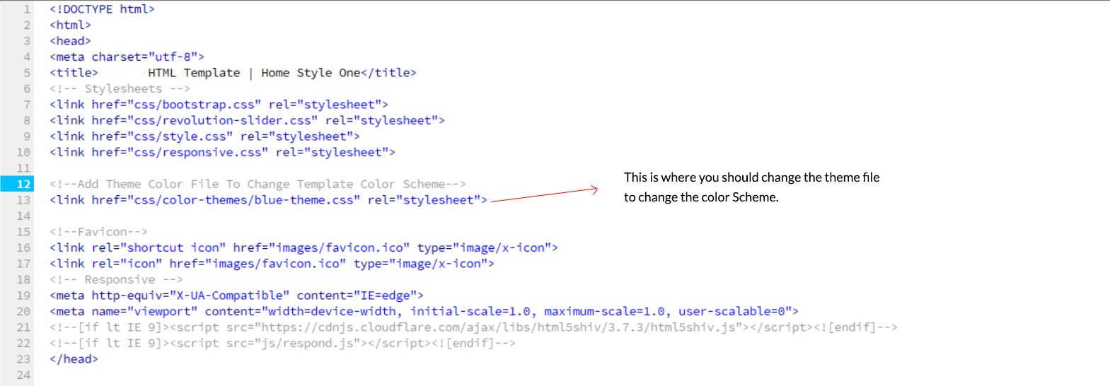 For Color Schemes we have created a 7 cool color schemes / files located in root/css/color-themes/color-theme.css. If you want to use a color you only need to add a that files as shown Below.